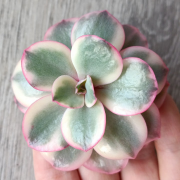 Красивая эхеверия с плоскими тонкими листьями. Розетка достаточно рыхлая. Листья окрашены в несколько цветов: зеленый, жёлтый, розовый.