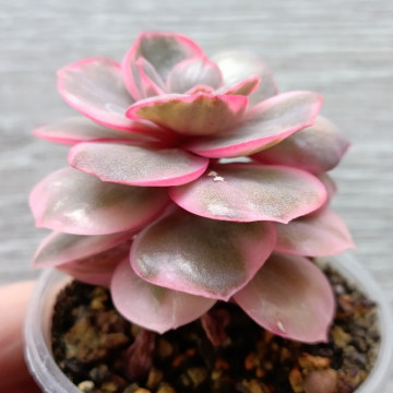 Эхеверия со средним размером листиков. Листики плоские, розетка достаточно рыхлая. Листья имеют несколько цветов: зеленый, жёлтый, розовый. Можно выращивать кустиком, если после полного укоренения формировать растение прищипыванием макушки.