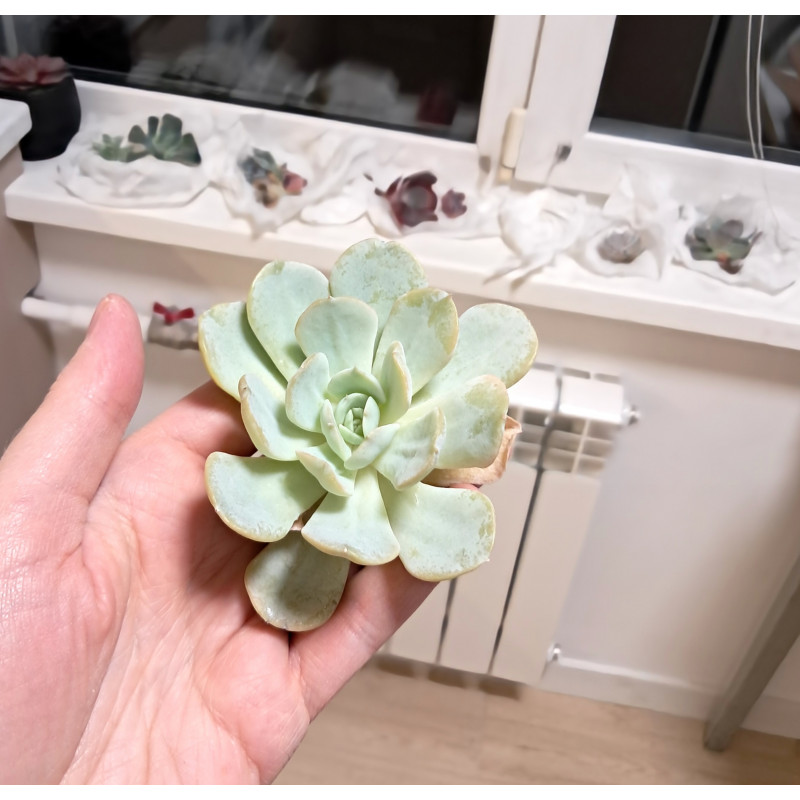 Выразительный сорт Echeveria runyonii с необычной формой листьев и окрасом. На сильном солнце в бедной почве листья на концах желтеют. Похожие растения: Echeveria 'Topsy-Turvy', Echeveria 'Exotica'. Цена за розетку 5-6 см.