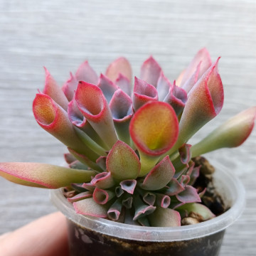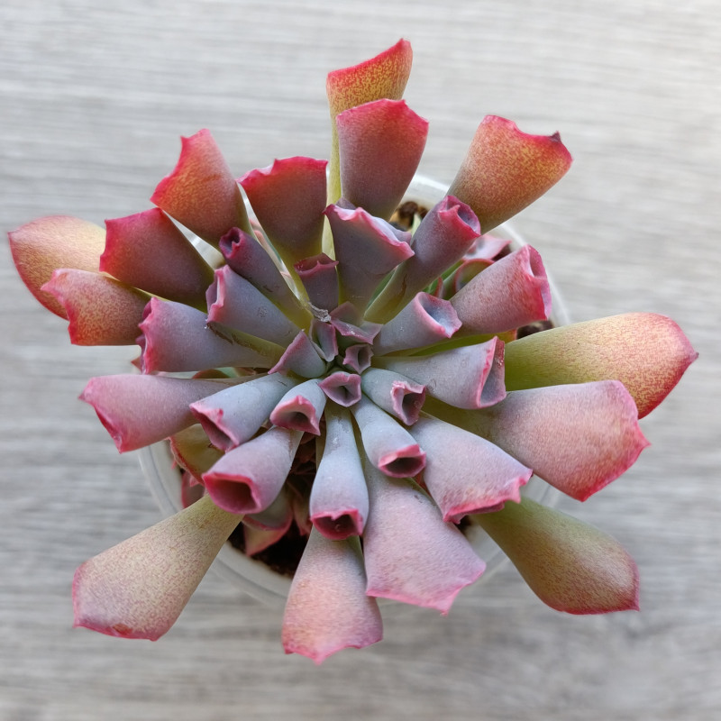 Одна из оригинальных эхеверий. Часть листиков выглядит как тонкие трубочки с воронкой на кончике. При ярком освещении цвет эхеверии ярко-розовый ближе к кончикам. Внизу под листиками часто вырастают детки.