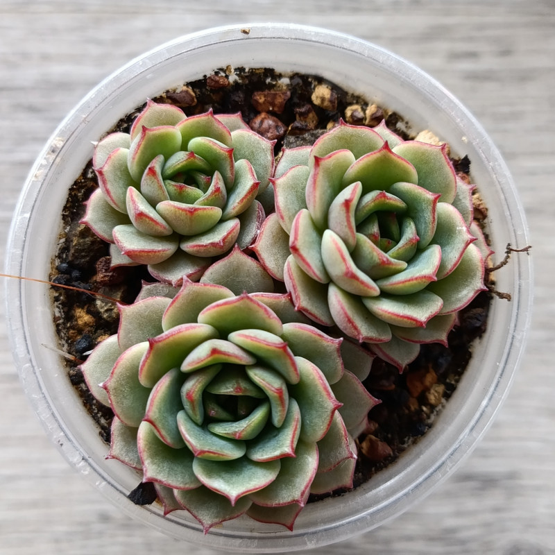 Эхеверия с розеткой в виде бутона из мелких листиков, плотно прижатых к друг другу. Цвет листьев ярко-зелёный с красной окантовкой. Красиво смотрятся кластерами по несколько штук.