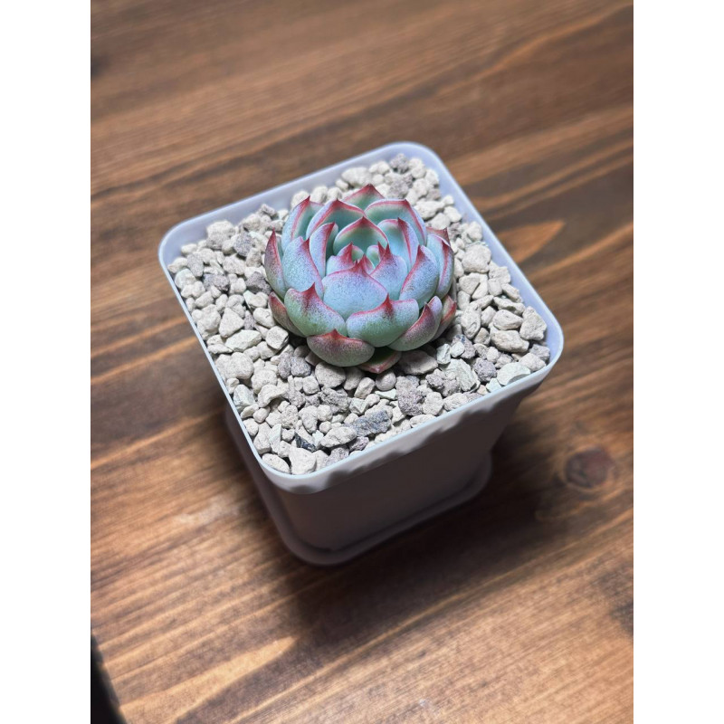 Детка корейской эхеверии. Имеет твердые чашеобразные листья с острым красным коготком и красной оккантовкой. Похожа на эхеверию Чихуахуенсис. Но отличается более твердым листом и холодным оттенком листа.