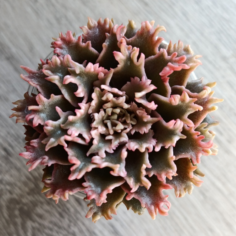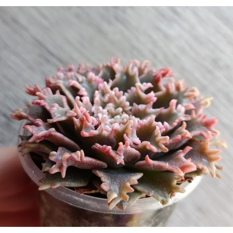 Граптоверия с красивыми резными листьями. Лист волнистый, окрашивается в красновато-розовый цвет. Насыщенность розового цвета зависит от яркости и длительности освещения. Не вытягивается, не капризная.