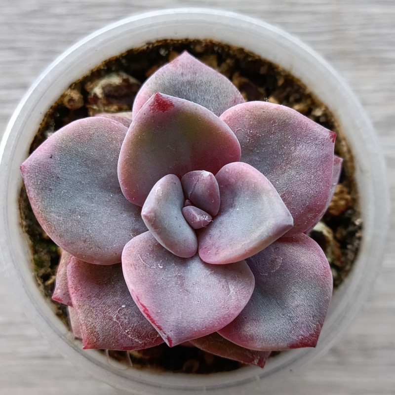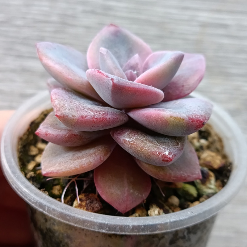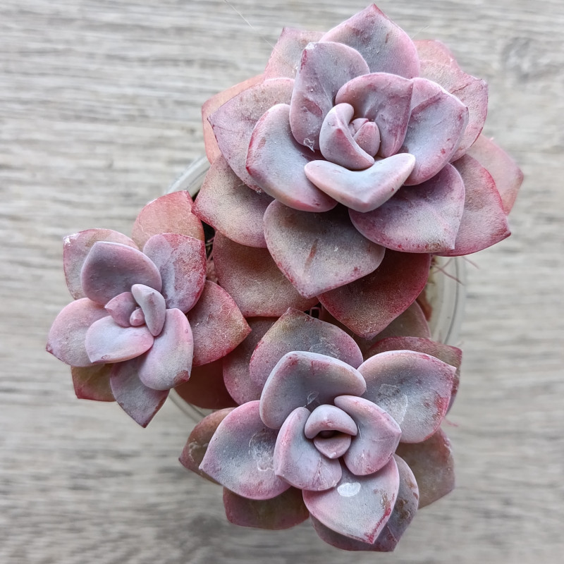 Яркая граптоверия с широкими листьями, которые неравномерно окрашены в оттенки малиново-розового и зеленого.