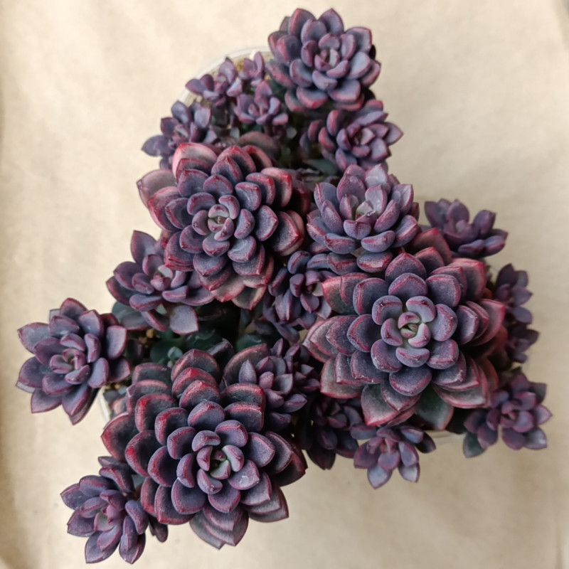 Граптоверия потрясающего цвета с оттенками от зелёного до темно-фиолетового и красного. Края листиков имеют более насыщенную красную окраску, которая зависит от яркости освещения. Растёт кустиками, розетки обычно 2-4 см в диаметре.