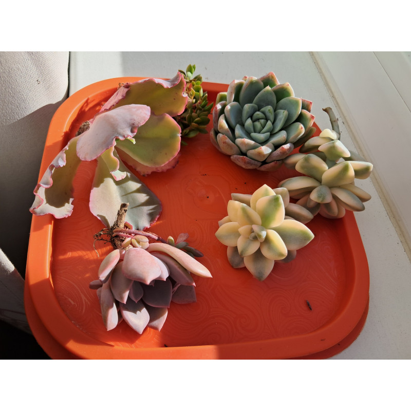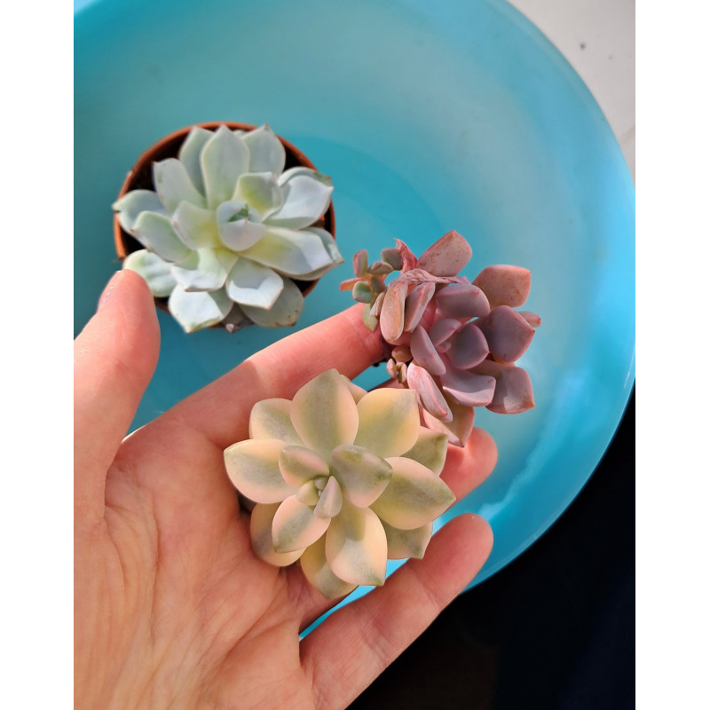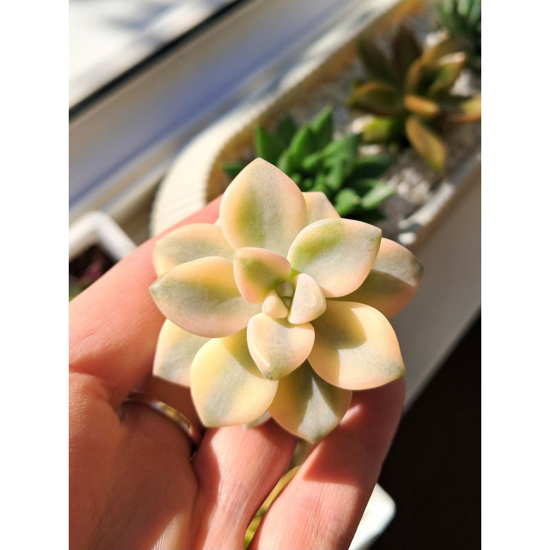 Розетка до 5 см в диаметре формируется из сочных листьев уникальной расцветки. На солнце они могут стать персиковыми с серо-зеленой полосой посередине. На самом деле это не "Титубанс", а граптопеталум берналенский, но растение более известно с неправильным названием. Существует и настоящая вариегатная граптоверия "Титубанс". Цена за черенок 4-5 см. как на втором фото.