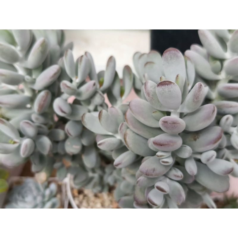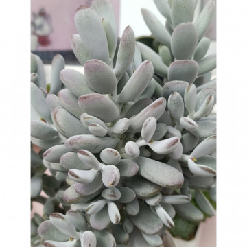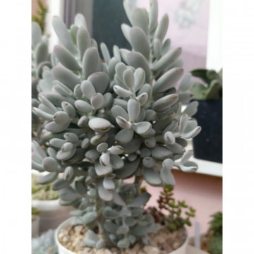 Очень декоративный котиледон, листья круглые, покрыты плотным белым налетом. Растет кустиком, охотно ветвится. В продаже срез веточки на 4 пары листьев.