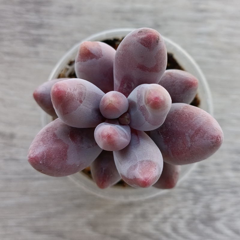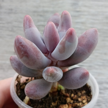 Розетка образована мясистыми округлыми листиками вытянутой формы. Цвет розоватый с небольшим налётом.
