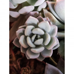 Рыхлооблиственный гибрид Pachyphytum bracteosum x Echeveria gibbiflora metallica. Листья светло-серого цвета, на свету становятся темно-розовыми. Несмотря на то, что вырастить плотную розетку затруднительно, такие листья выглядят очень красиво. Цена за розетку 3-4 см.