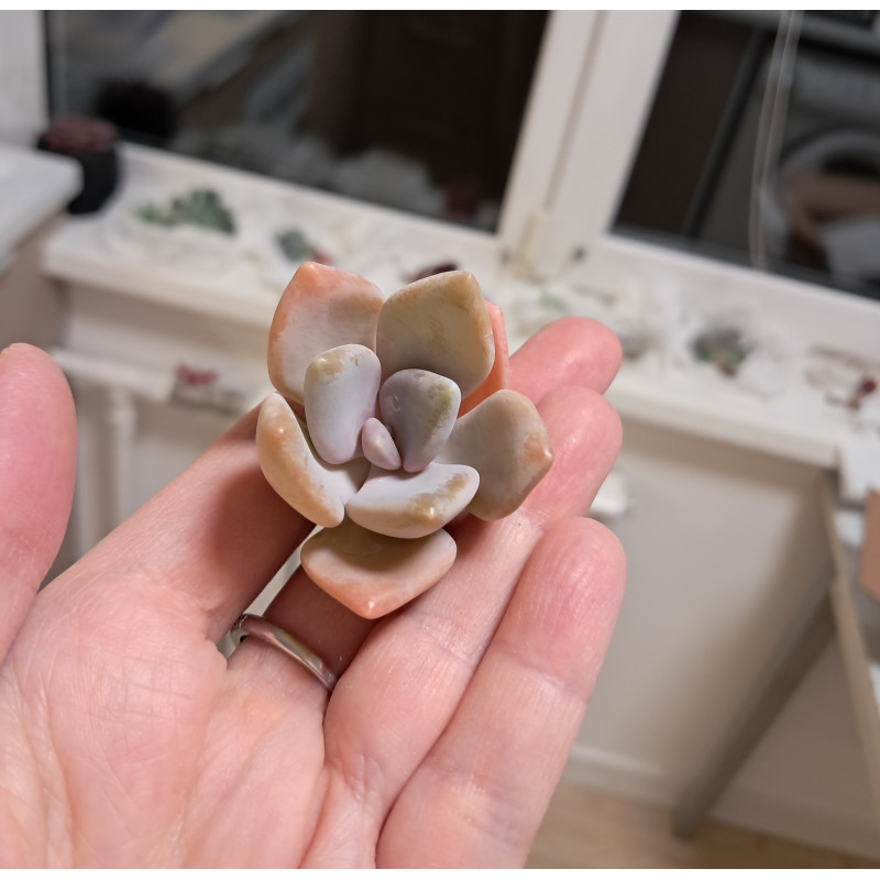 Рыхлооблиственный гибрид Pachyphytum bracteosum x Echeveria gibbiflora metallica. Листья светло-серого цвета, на свету становятся темно-розовыми. Несмотря на то, что вырастить плотную розетку затруднительно, такие листья выглядят очень красиво. Цена за розетку 3-4 см.