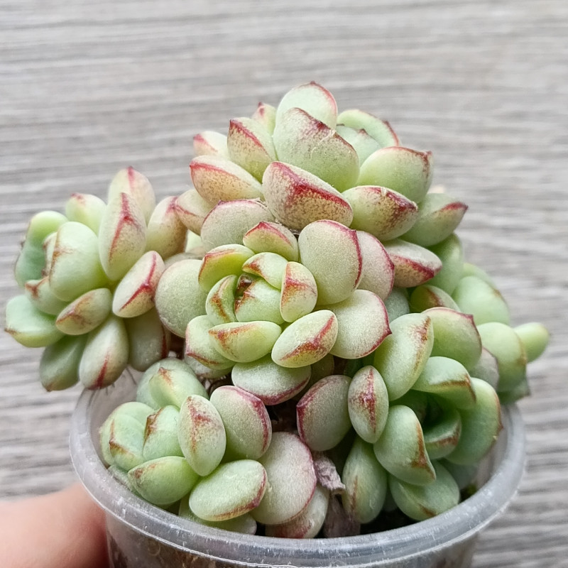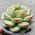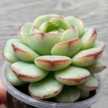 Розетка со светло-зелеными пухлыми листиками с красной каймой.