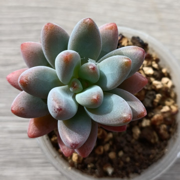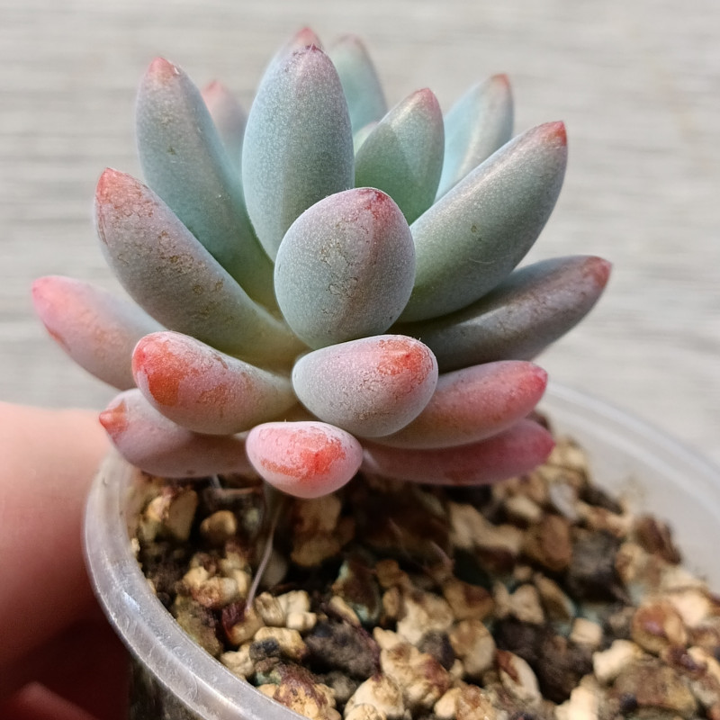 Растение с мясистыми листьями вытянутой формы. Цвет зелёный с сиреневым отливом, кончики розовые.
